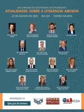É com imensa alegria que Programa de Pós-Graduação em Direito Processual da Universidade Federal do Espírito Santo (PPGDIR-UFES) em parceria com a Escola da Magistratura do Estado do Espírito do Tribunal de Justiça do Estado do Espírito Santo (EMES) e com a Escola Superior da Advocacia da Ordem dos Advogados do Espírito Santo (ESA-OAB) informa e convida todas e todos para a Aula Magna do Doutorado do Programa de Pós-Graduação em Direito Processual (PPGDIR-UFES), que será realizada no dia 22 de agosto de 2025, das 09:00 às 12:00 horas, no Teatro da Universidade Federal do Espírito Santo.